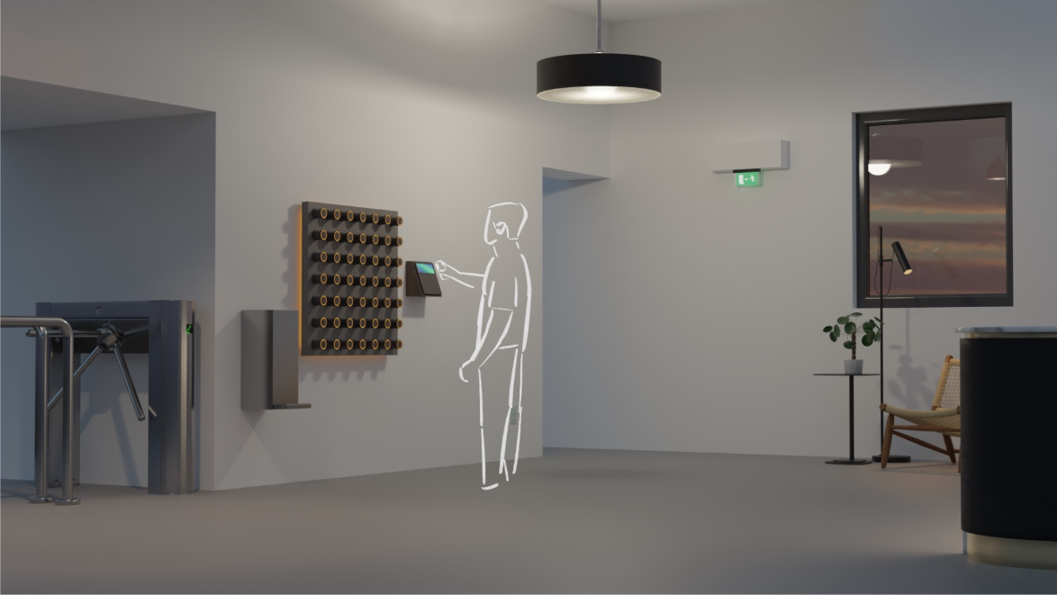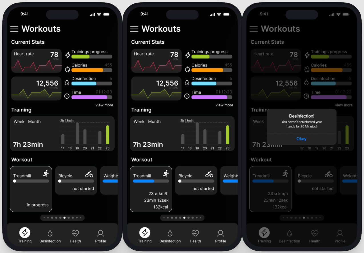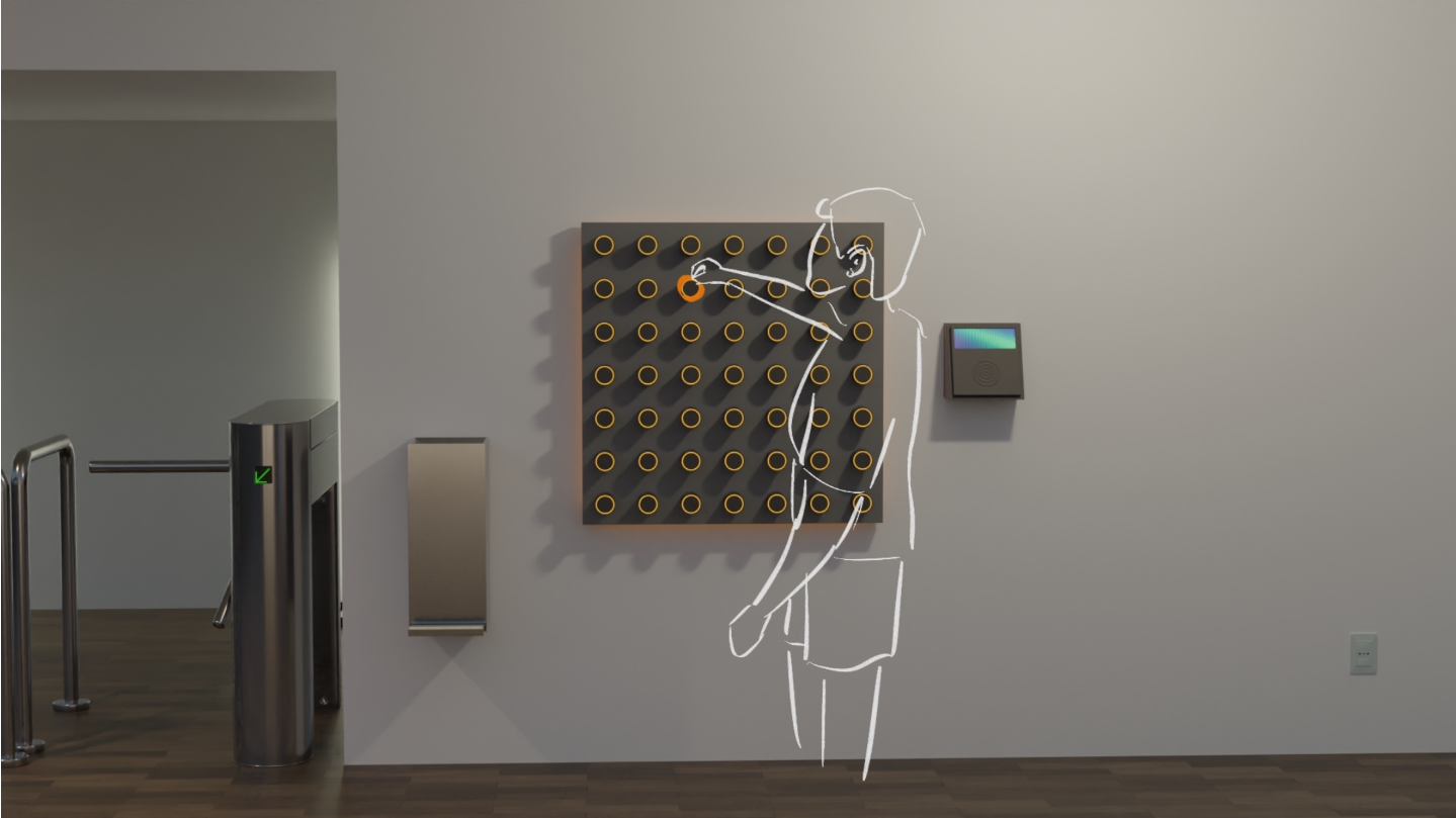 It comprises a product family consisting of 5 different components that are connected to each other. Firstly, a wristband with integrated disinfectant and an NFC chip, a smartphone app, a dispensing station, the wristband-device interface and a disinfectant dispenser for refilling.